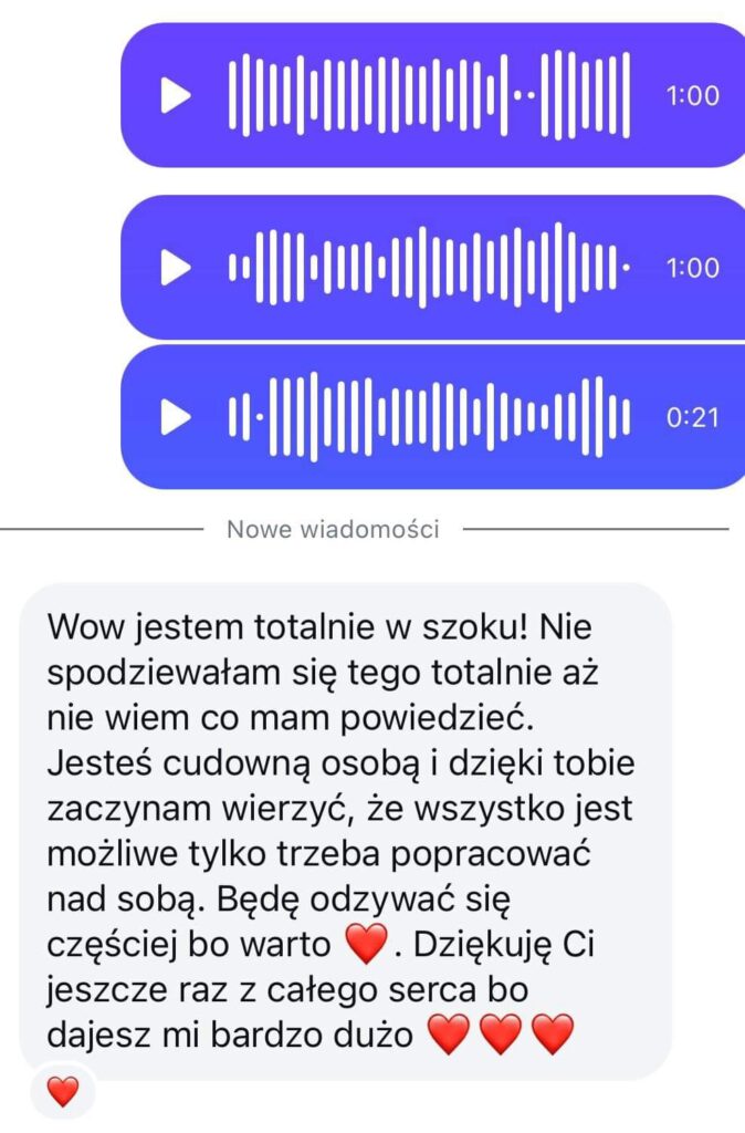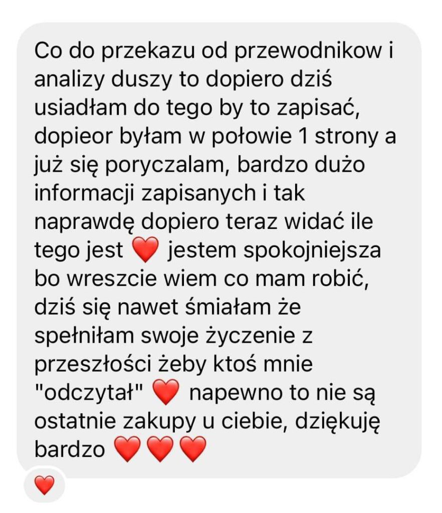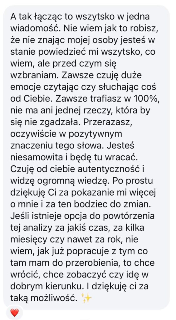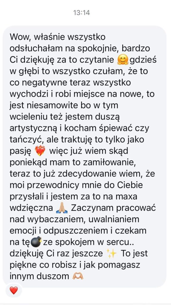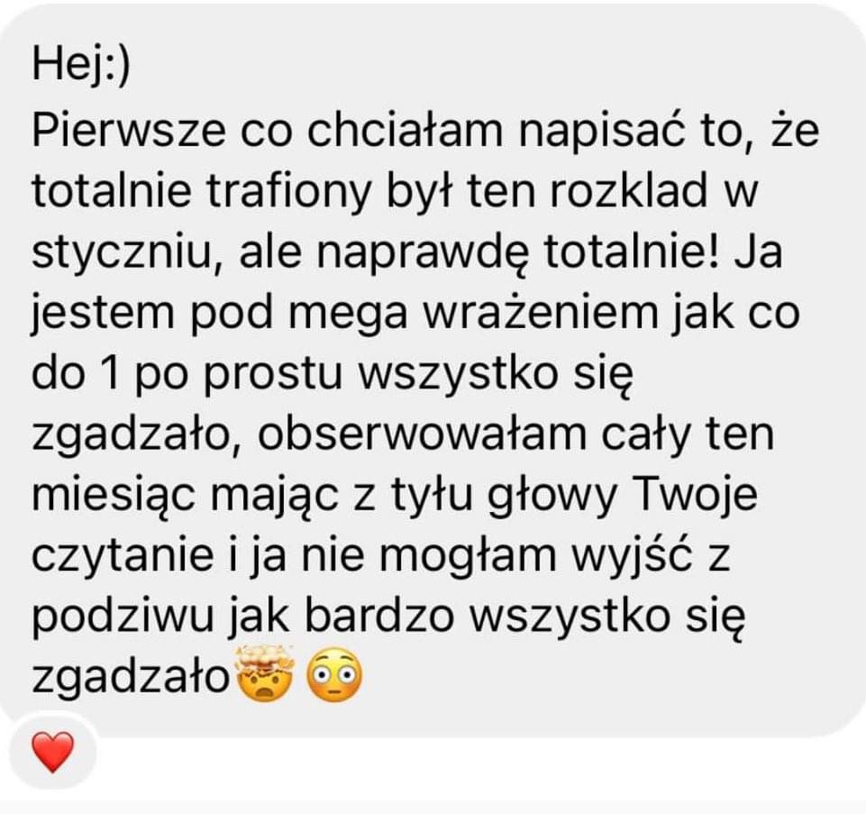 ,,Cześć! Nie mogę uwierzyć jak Twój odczyt pomógł mi w ostatnich dniach. Wzięłam do serca wszystkie wskazówki i dzięki temu udało mi się naprawić to na czym mi zależało. A reszta całkowicie się sprawdziła! Twoje odczyty to mistrzostwo!!! Dziękuję Ci z całego serca <3"