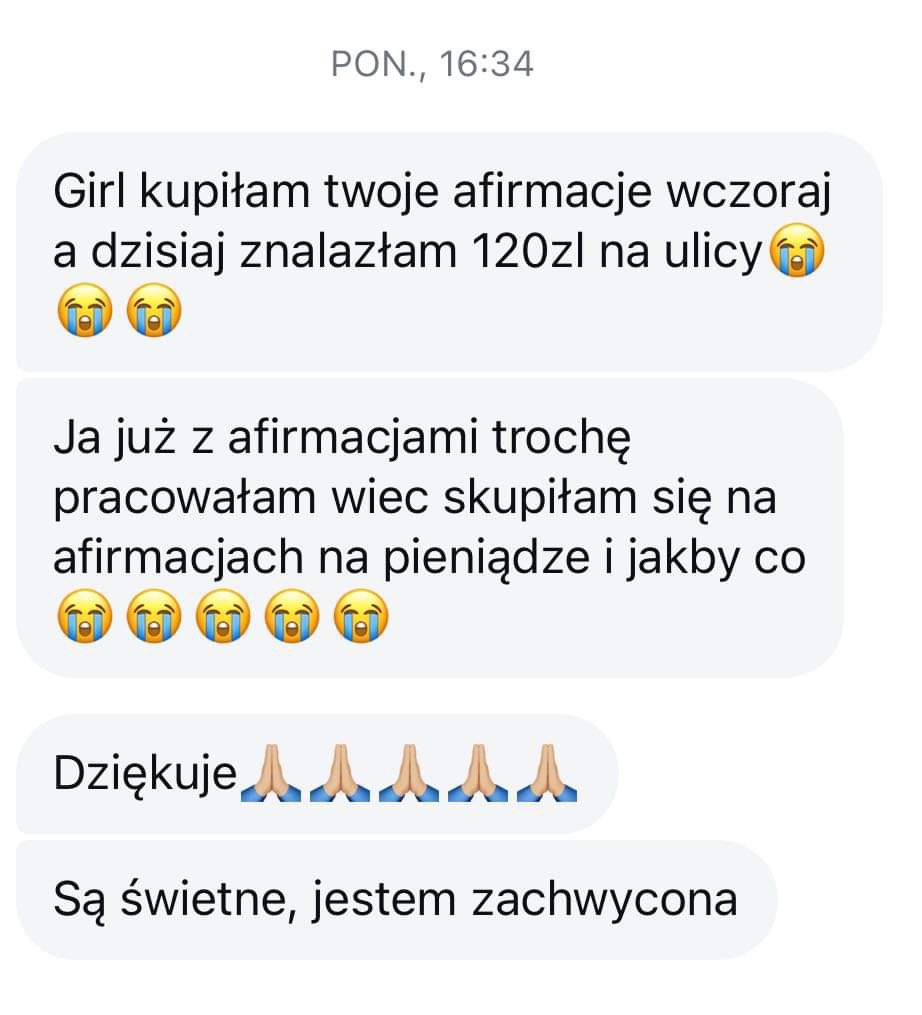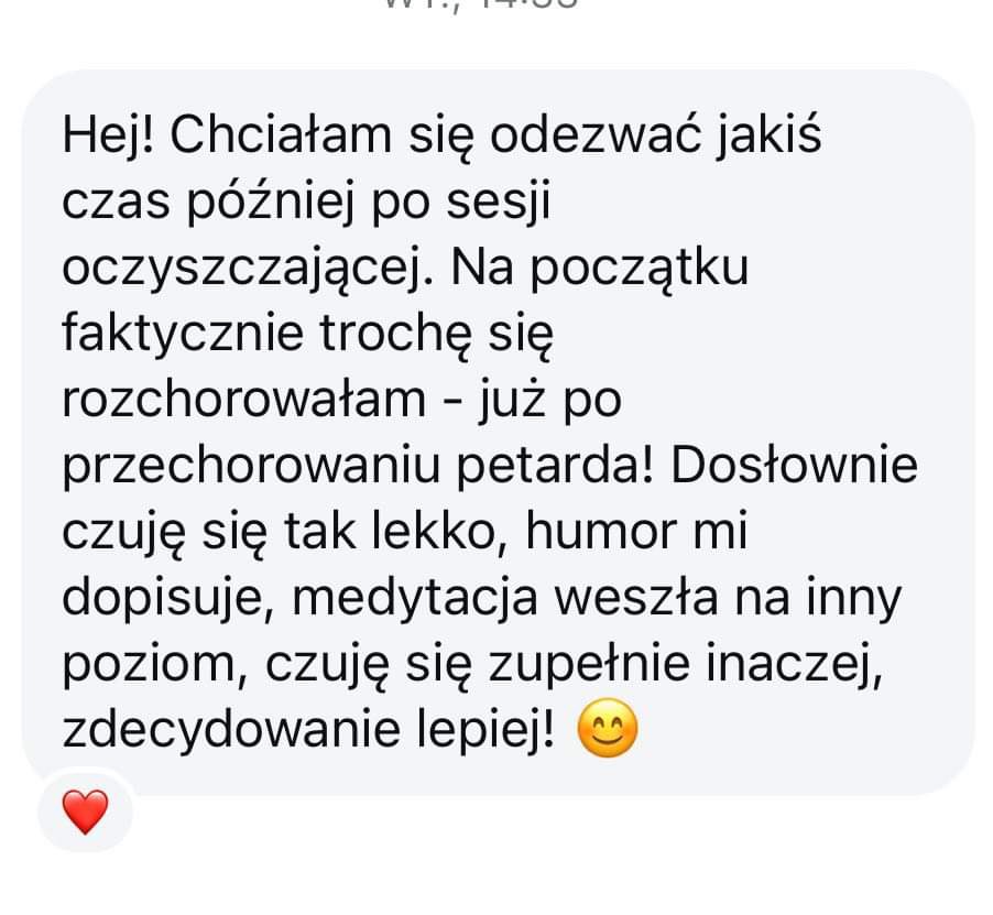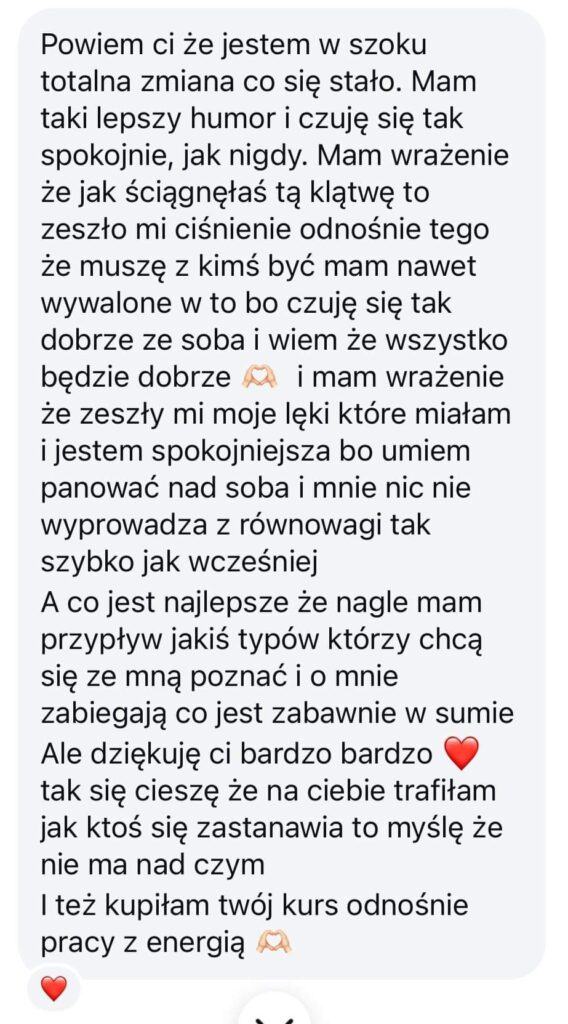 ,,Powiem Ci że jestem w szoku, totalna zmiana co się stało. Mam taki lepszy humor i czuję się tak spokojnie, jak nigdy. Mam wrażenie, że jak ściągnęłaś tą klątwę, to zeszło mi ciśnienie. Czuję się tak dobrze, ze sobą i wiem, że wszystko będzie dobrze <3. Mam wrażenie też, że zeszły moje lęki, które miałam i jestem spokojniejsza bo umiem panować nad sobą i nic nie wyprowadza mnie z równowagi tak szybko jak wcześniej. Dziękuję bardzo, tak się cieszę, że na ciebie trafiłam <3"